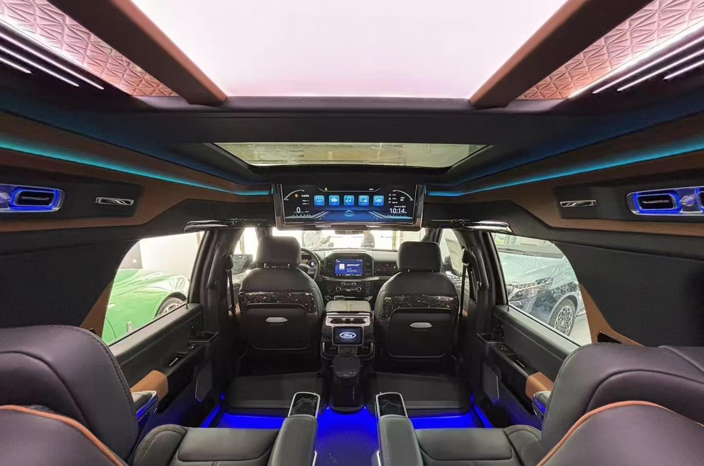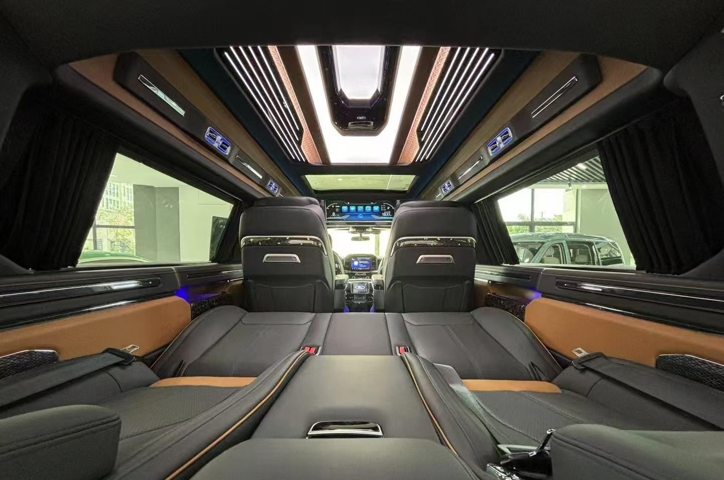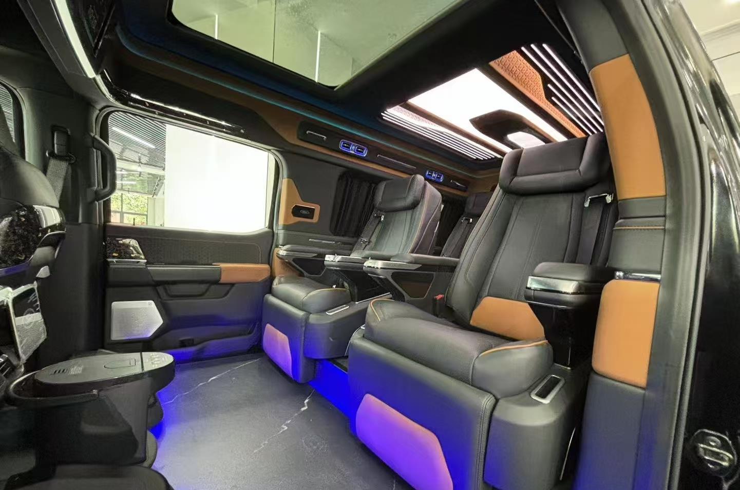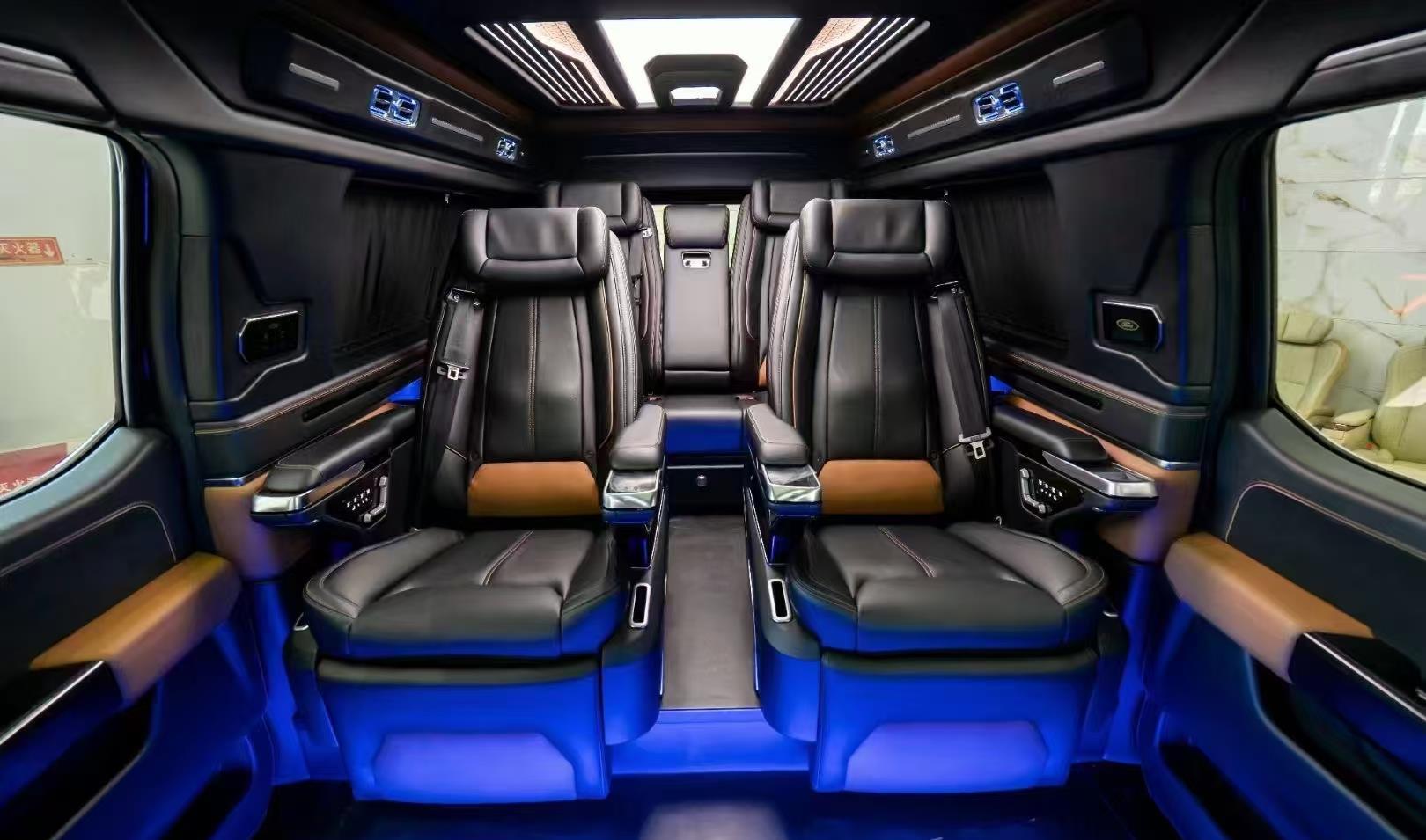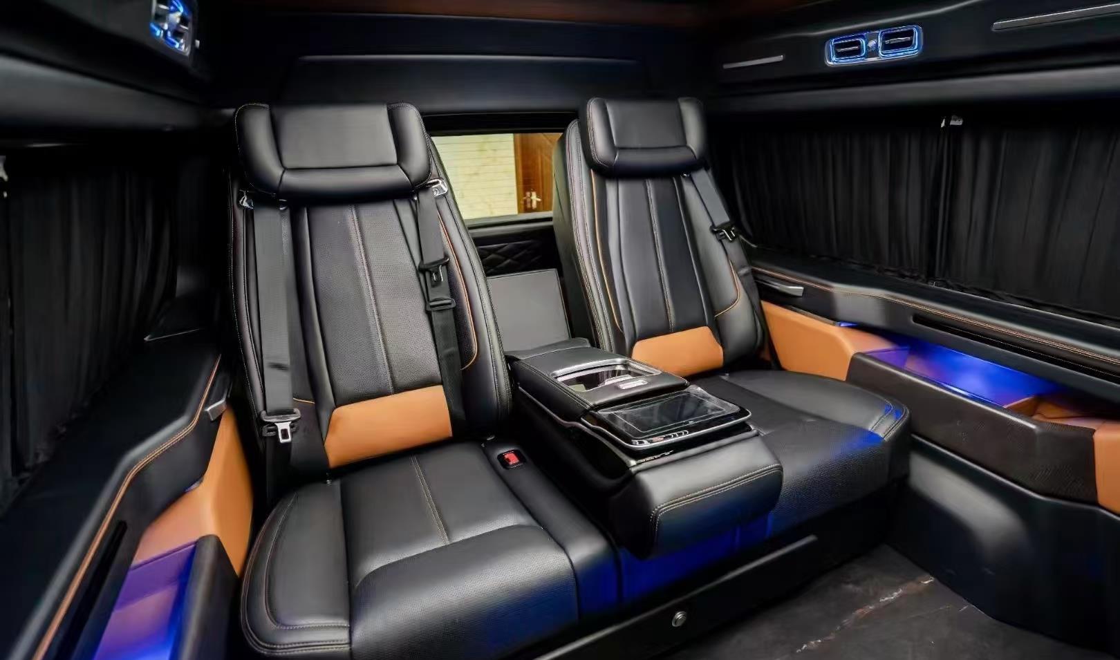 豪华座舱与灵活空间完美兼顾。采用2+2+3七座布局,全车配备真皮座椅,二排航空商务座椅集成通风、加热、按摩功能,搭配可折叠小桌板与隐私帘,营造出专属高端移动空间。三排座椅支持放倒拓展,瞬间变身舒适大床,满足长途休憩或露营需求。车内还配备12英寸中控触控屏、数字仪表 cluster 及高清网络电视,搭配Bo音响系统,将科技感与娱乐性融为一体。